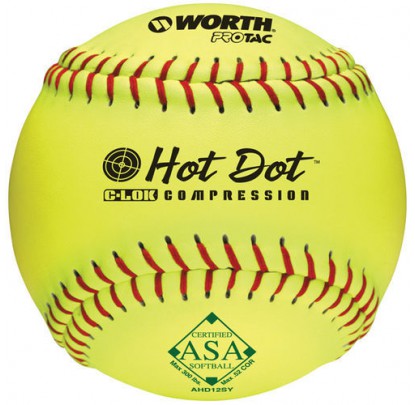 Las pelotas de sóftbol Worth® ASA® Hot Dot™ cuentan con la exclusiva tecnología C-LOK® para repeler la humedad y mantener una compresión ideal. La pelota de sóftbol de lanzamiento lento Hot Dot™ de ASA® cuenta con una cubierta amarilla sintética ProTac® y una calificación de COR de .52. La compresión Hot Dot™ de 300 lb brinda mayor potencia y durabilidad a través del calor y el frío, mientras que las costuras rojas elevadas mejoran el agarre.